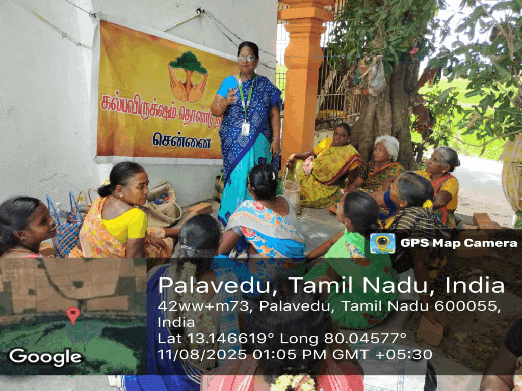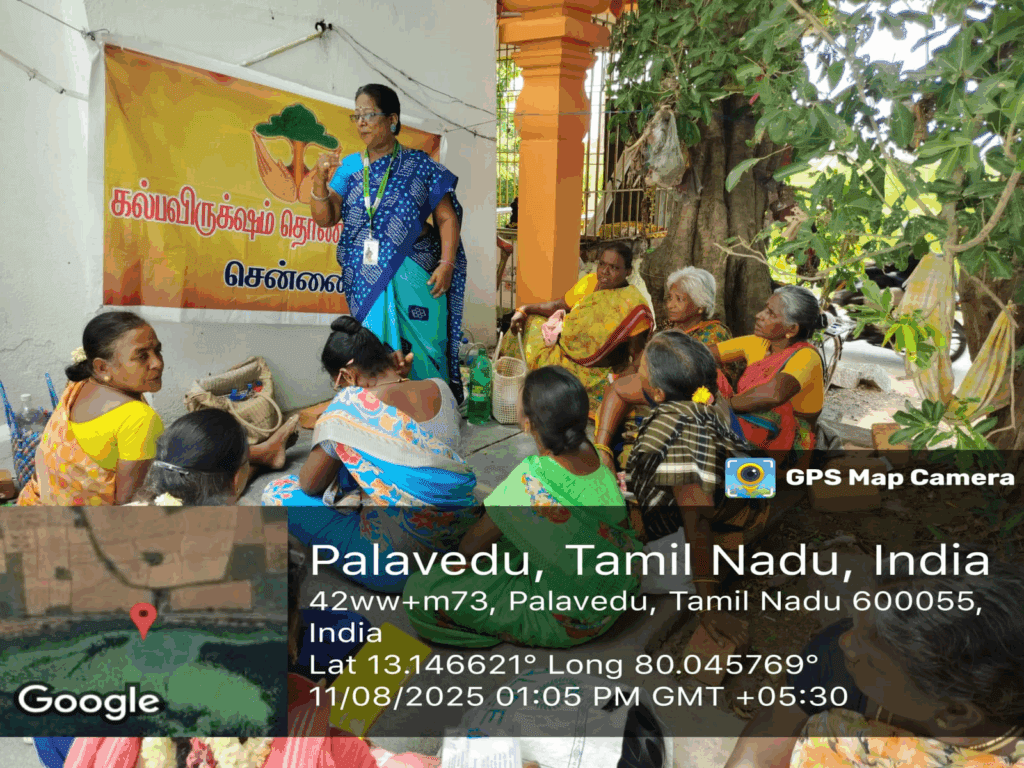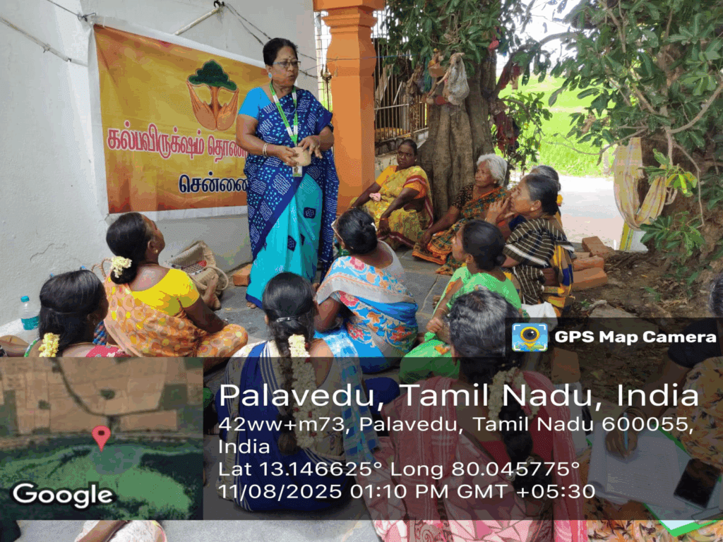 Kalpavriksham Trust, in collaboration with Privaram Cancer Hospital, organized a Cancer Awareness Talk at Palavedu Pettai.The session was attended by over 23 participants and focused on the importance of self-breast examination, mammograms, and Pap smear tests. Emphasizing the critical role of these screenings in early detection and cancer prevention, the session provided participants with practical insights into the procedures, their benefits, and the necessity of regular health check-ups. This initiative aimed to empower individuals with knowledge, raise awareness, reduce cancer risks, and promote proactive health practices for improved community well-being.