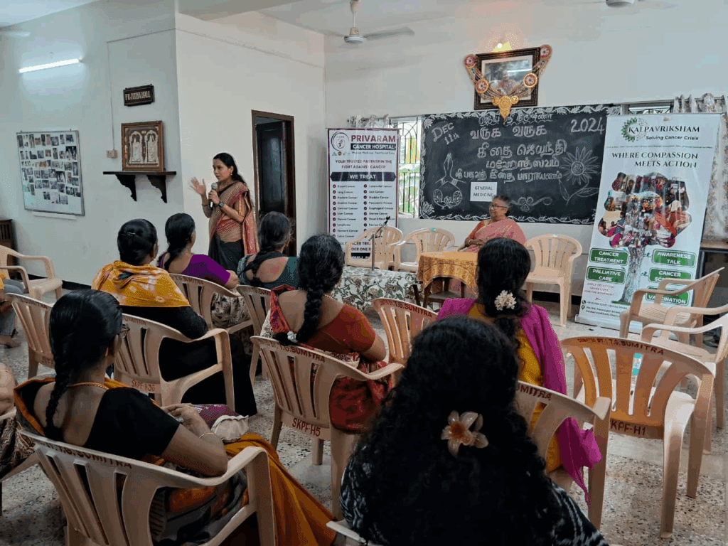 Kalpavriksham Trust collaborated with Privaram Cancer Hospital to organize an awareness talk at Sri Santhanakrishna Padmavathy Healthcare Foundation, Chrompet. The Cancer Awareness Talk, Dr. Banu Priya led the session, attended by 30 participants, aims to educate and empower the community on the importance of early detection and preventive healthcare. By understanding risk factors, recognizing early symptoms, and adopting a healthy lifestyle, individuals can significantly reduce their chances of developing cancer. Through expert talks, free screenings, and interactive sessions, this initiative encourages everyone to take charge of their health and spread awareness. Early detection saves lives—let’s come together to make a difference!