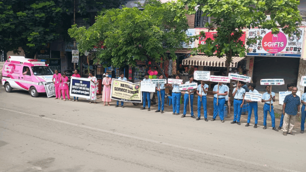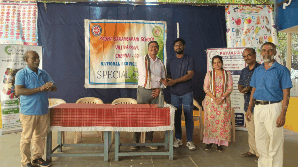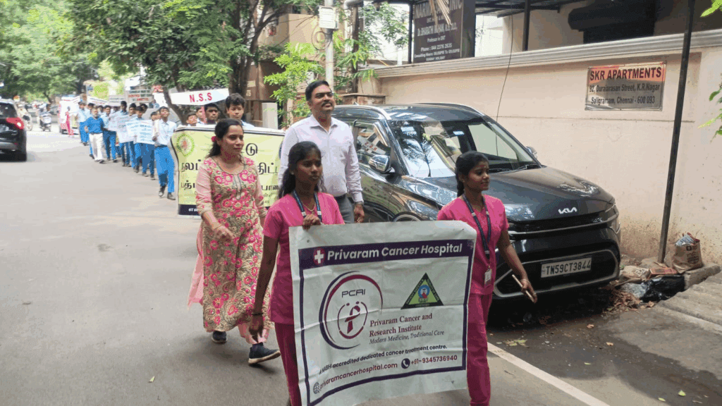 The NSS unit of Padma Sarangapani School, Virugambakkam, successfully organized a Cancer Awareness Walkathon with the mission of promoting early detection and prevention of cancer, along with the active participation of 30 students, graced by Chief Guests Dr. M. Banupriya (Founder, Privaram Cancer Hospital & Kalpavriksham) and Dr. L. Manikandan (Managing Director, Privaram Cancer Hospital & CEO, Kalpavriksham), who emphasized the importance of community-driven initiatives in creating a cancer-aware society, with special thanks to Mr. E. Ramachandran (NSS Programme Officer) and Mr. Nagarajan (NSS Assistant Programme Officer) for their efforts in organizing and motivating students to take part in this meaningful walk, as together we continue to spread hope, awareness, and the light of prevention.