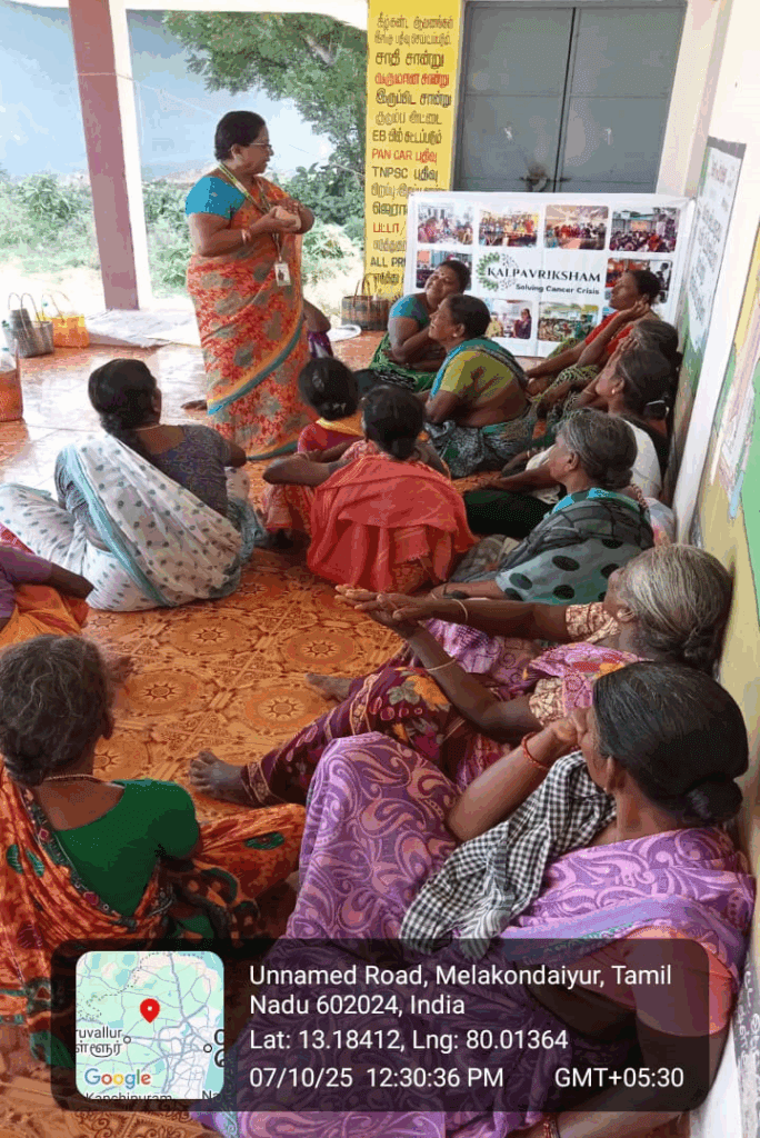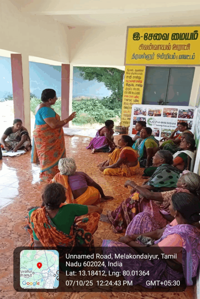 Kalpavriksham Trust, in collaboration with Privaram Cancer Hospital, organized a Cancer Awareness Talk at Melakondaiyar Village, Thiruvallur. The session reached 14 participants, highlighting the importance of mammogram and Pap smear screenings in the early detection and prevention of breast and cervical cancers.The speaker offered clear and practical insights into the procedures, benefits, and necessity of these tests, inspiring participants to adopt proactive health practices. This initiative aimed to empower the community through awareness, encouraging timely screenings and informed health decisions, paving the way for a healthier future.