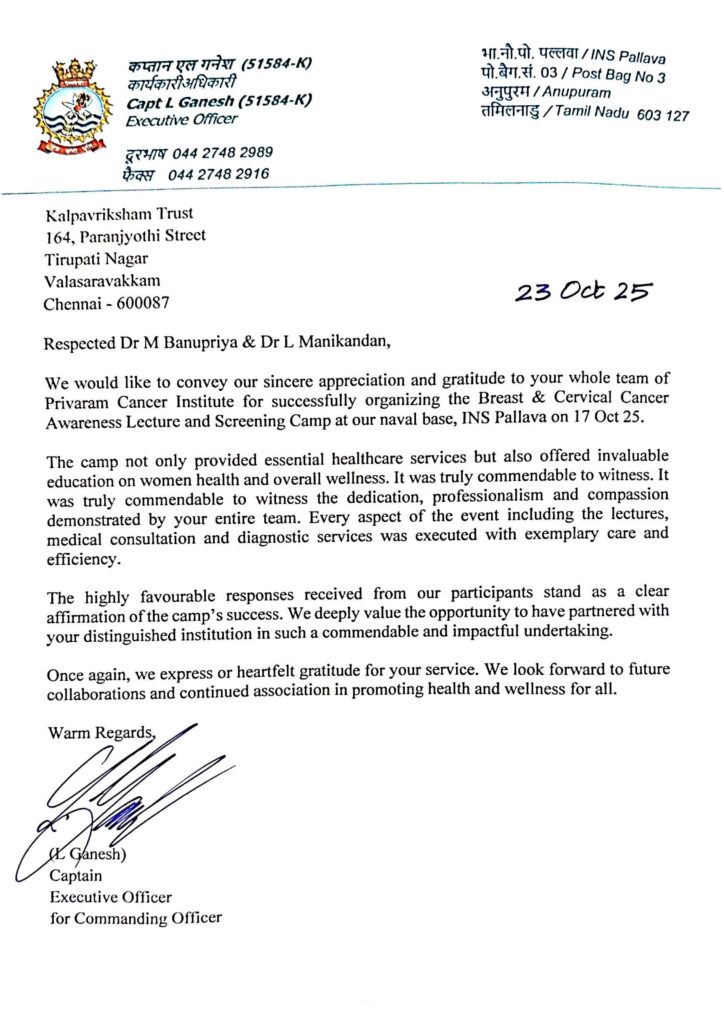 We are honored to express our heartfelt appreciation and gratitude to the entire team of Privaram Cancer Institute for successfully organizing the Breast and Cervical Cancer Awareness Lecture and Screening Camp at our naval base, INS Pallava, on 17 October 2025.