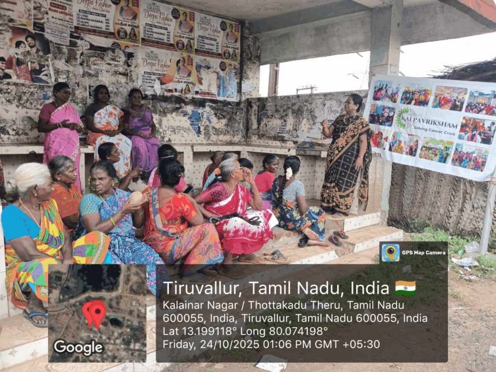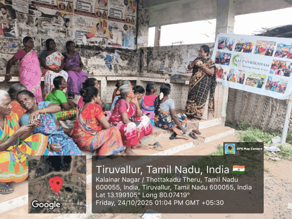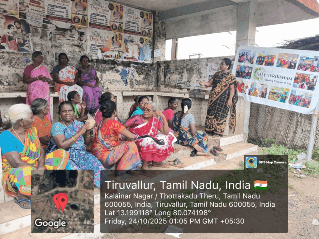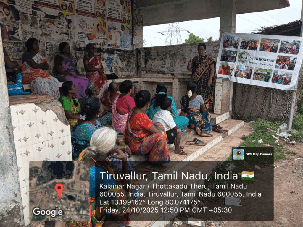 Kalpavriksham Trust, in collaboration with Privaram Cancer Hospital, organized a Cancer Awareness Talk at Kalainar Nagar-Bus Stop, Pandeeshwaram.The session educated 23 participants on the importance of mammogram and Pap smear screenings, emphasizing their critical role in early detection and prevention of breast and cervical cancers. The speaker provided clear insights into the procedures and benefits of these tests, motivating attendees to adopt proactive health practices. This initiative aimed to empower the community through awareness, encouraging timely screenings and informed health decisions for a healthier future.