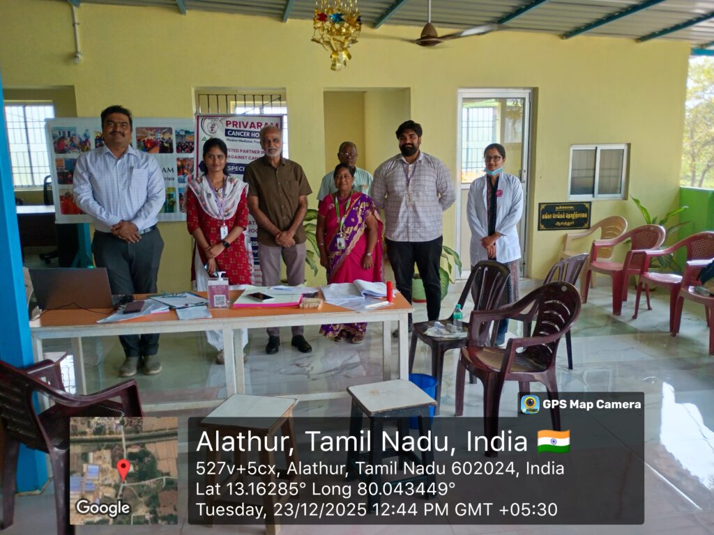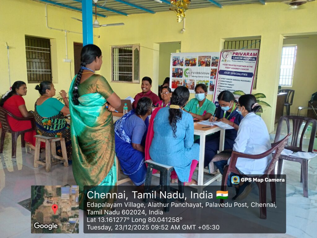 A Cancer Screening Camp was successfully conducted on 23rd December 2025 at Udhavum Nanbargal, Alathur Panchayat, Palavedu Post, Chennai, under Project Femicare+. Organized by Kalpavriksham Trust, in collaboration with Udhavum Nanbargal and Privaram Cancer Hospital, the camp focused on early detection and prevention through essential screening services.