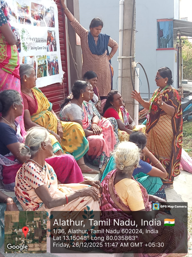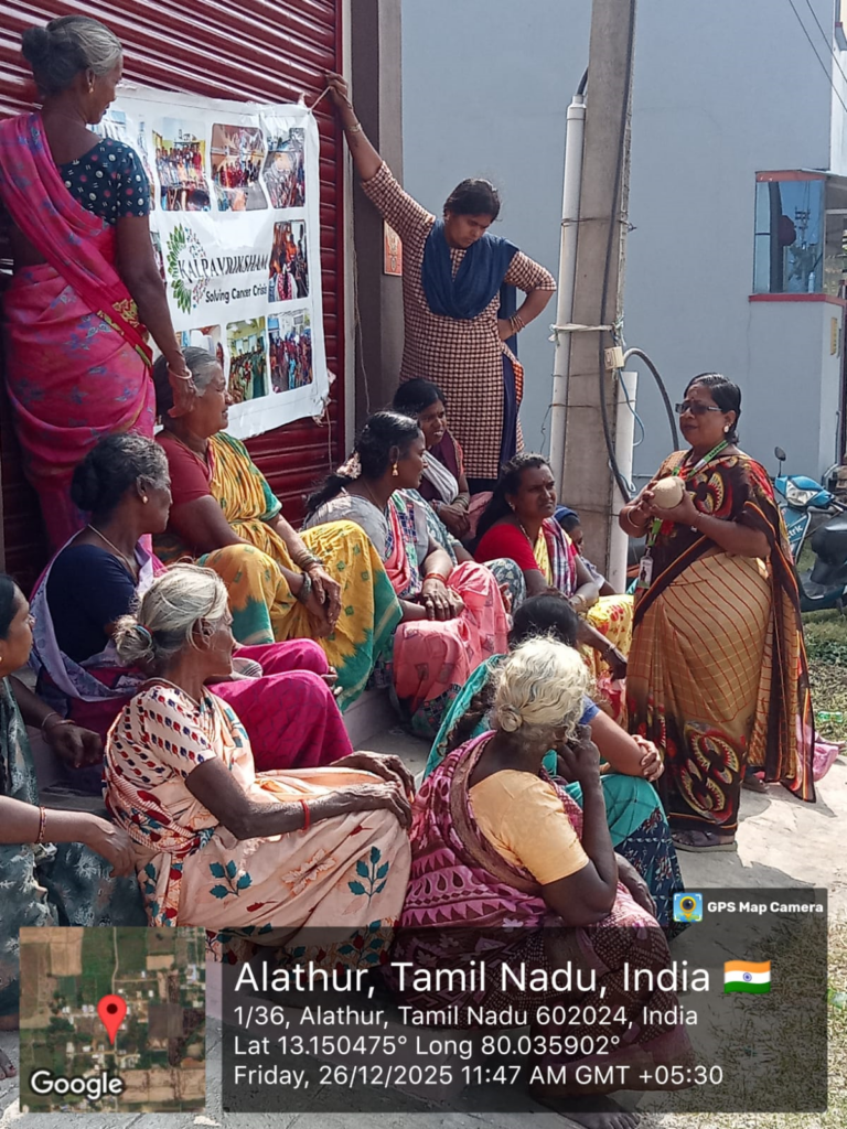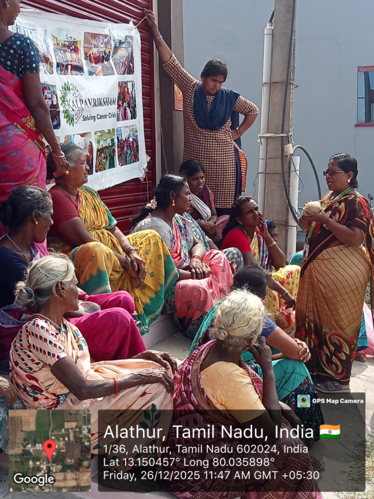 Kalpavriksham Trust, in collaboration with Privaram Cancer Hospital, organized a Cancer Awareness Talk at Srinivasa Nagar, Pakkam Thiruvallur.The session educated 16 participants on the importance of mammogram and Pap smear screenings, emphasizing their critical role in early detection and prevention of breast and cervical cancers. The speaker provided clear insights into the procedures and benefits of these tests, motivating attendees to adopt proactive health practices. This initiative aimed to empower the community through awareness, encouraging timely screenings and informed health decisions for a healthier future.