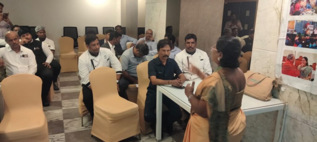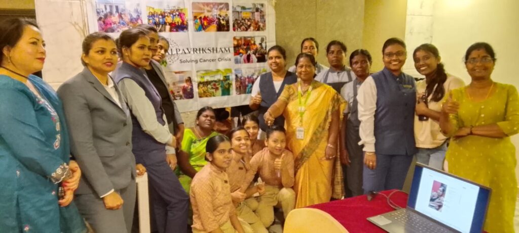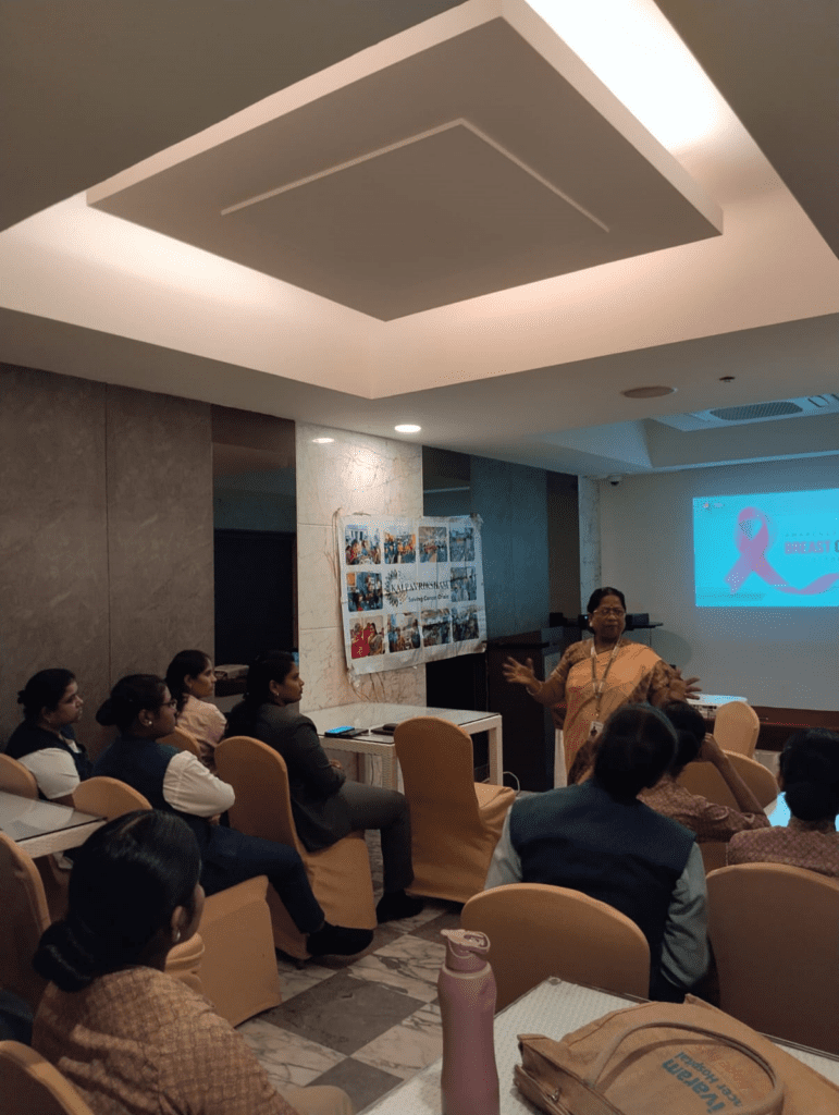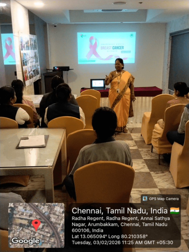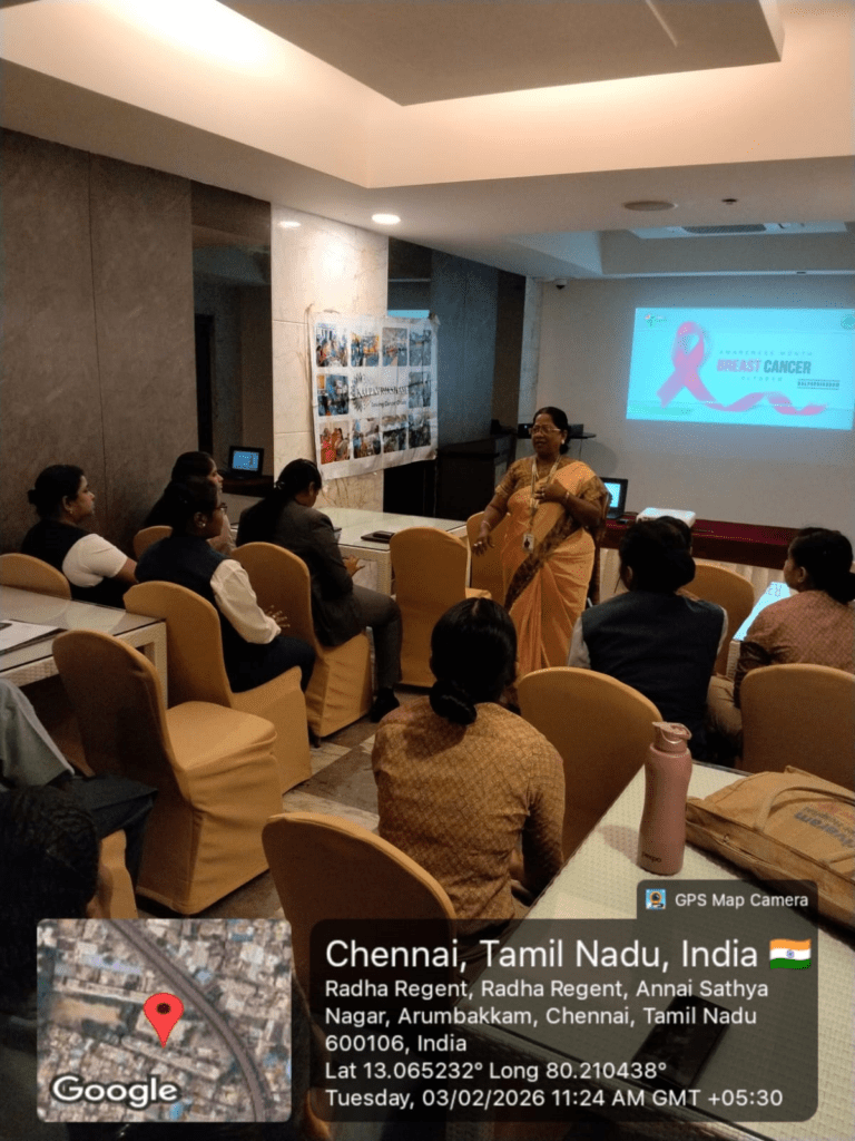 Kalpavriksham Trust, in collaboration with Privaram Cancer Hospital, organized a Cancer Awareness Talk at Radha Regent Hotel, Jawaharlal Nehru Salai, Arumbakkam, with the participation of 43 staff members (20 women and 23 men).The session focused on breast cancer awareness, highlighting the importance of regular self-breast examinations for early detection. Participants were educated on recognizing symptoms, understanding risk factors, and the need for timely medical screenings. The program encouraged proactive health practices, emphasizing early intervention and preventive care to support long-term breast health.