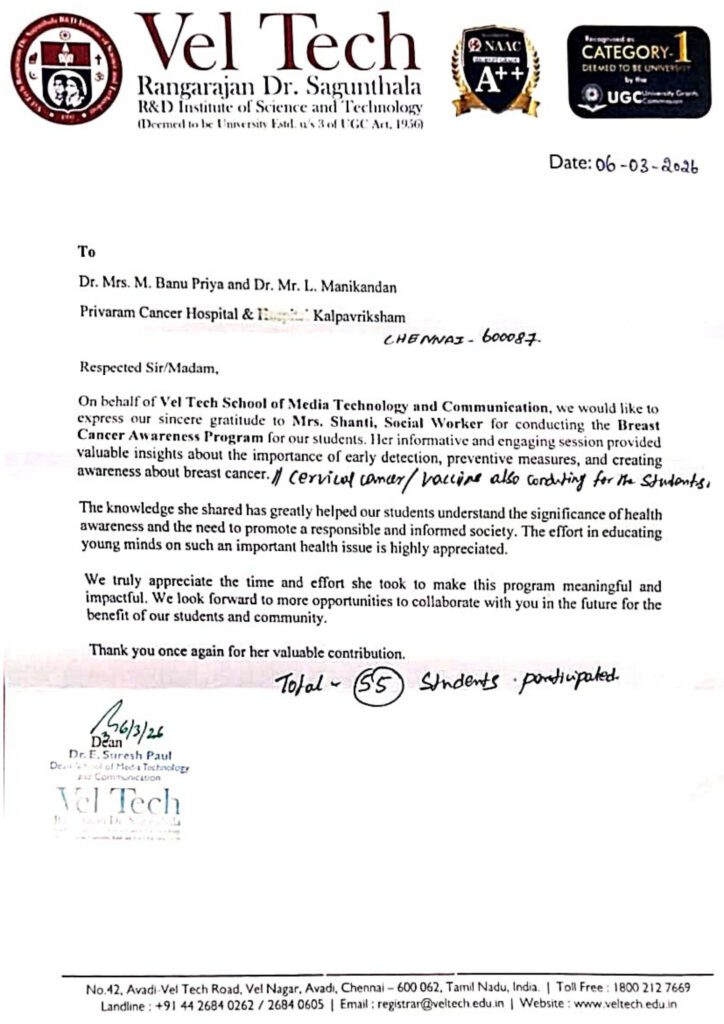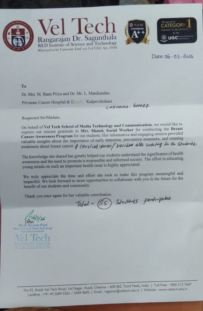 Kalpavriksham Trust, in collaboration with Privaram Cancer Hospital, successfully conducted a Breast and Cervical Cancer Awareness Program at Vel Tech Rangarajan Dr. Sagunthala R&D Institute of Science and Technology, Avadi, Chennai.