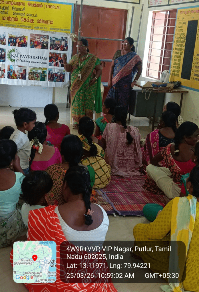 Kalpavriksham Trust, in collaboration with Privaram Cancer Hospital, organized a Cancer Awareness Talk at VPC Building, Putlur, Thiruvallur. The session educated 45 women participants on the importance of mammogram and Pap smear screenings, emphasizing their critical role in the early detection and prevention of breast and cervical cancers. The speaker provided clear insights into the procedures and benefits of these tests, motivating attendees to adopt proactive health practices. This initiative aimed to empower the community through awareness, encouraging timely screenings and informed health decisions for a healthier future.