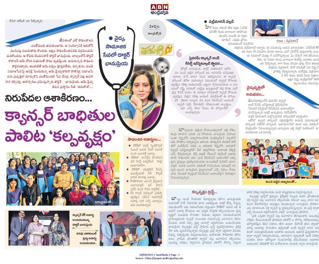 The feature in ABN Andhra Jyothi highlights the remarkable efforts of Kalpavriksham Trust in spreading cancer awareness, supporting patients, and empowering communities. Published on 20-09-2025