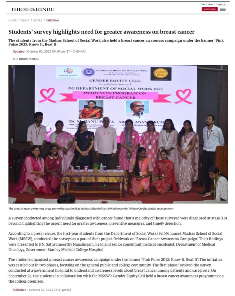The Breast Cancer Awareness Program held at Madras School of Social Work (MSSW) received wide recognition in the press