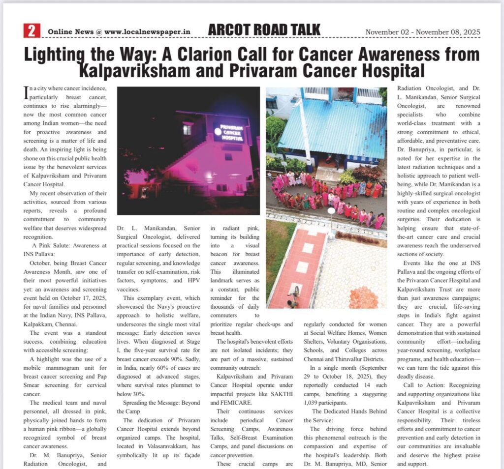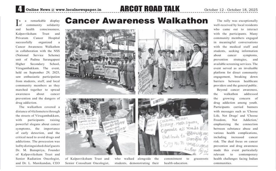 Cancer Awareness Walkathon organized by the NSS unit of Padma Sarangapani Higher Secondary School, in collaboration with Kalpavriksham Trust and Privaram Cancer Hospital, was Published in The Hindu – Downtown and Arcot Road Talk newspapers On 12th October 2025